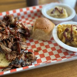 Brew Hawgs is nestled in a smallish strip mall off of Tustin. The marquee reads "BBQ to go", not actually "BrewHawgs", so watch for that. Other than that it's easy to get to and parking is plentiful. There is limited inside seating (which has a welcoming, southern feel) and additional outside seating. Their BBQ sauce selections are up along the wall and are available to take to your table as you dine. The gal at the counter was very welcoming and friendly as she took orders and delivered food to the tables. There's a great variety of sandwich and meat plate options. I like how they're more unique than other BBQ places in the area. The choices for sides are great, too! At this visit I ordered the Knuckle sandwich (fun play on words!), with a side of mac & cheese. The mac and cheese was perfectly seasoned and cheesy. The sandwich was a delightful combo of pulled pork and a fried egg in a brioche bun. SO good! The one thing I would prefer here, tho, would be Coke over Pepsi. So overall, I'd say head on over and give Brew Hawgs a try. I'm pretty sure you'll discover your new favorite BBQ joint!